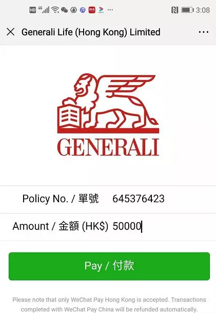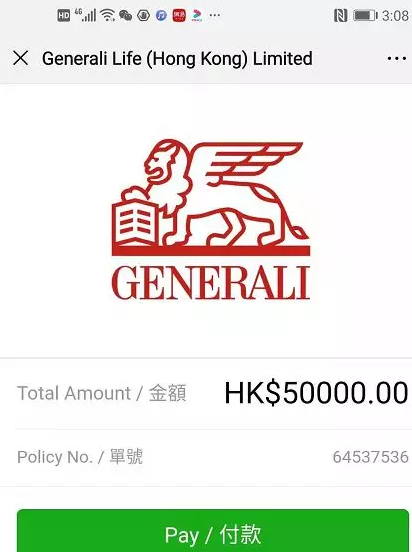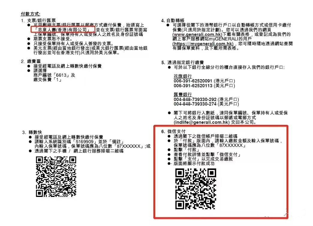 據香港忠意人壽保險公司發佈的繳費指引顯示,對於年繳1萬美元以下的保單,可以直接微信掃描二維碼,填寫金額和保單號即可繳付保費,匯率按照即時匯率進行換算。