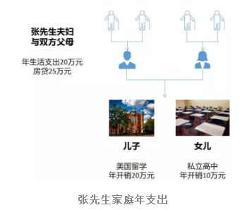 張先生兩口子和雙方父母每年的生活費用總共20萬元左右。兩套房子,每套一個月要還1萬元左右的房貸,一年房貸支出約25萬元,還有5年還清。算下來,張先生家庭的年支出為75萬元。