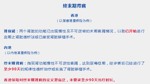家人找保險公司索賠時,保險公司給出的原因是:終末期腎病確實屬於重疾險的保障範圍,但並不是確診即賠。終末期腎病,需要進行至少90天的規律性透析治療或實施了腎臟移植手術,才會賠償。李先生的治療時間並沒有滿90天,因此不賠。但在香港保險的重疾定義中,並未對治療時間進行規定。因此,如果他這份保單是在香港買的,是可以獲得理賠的。