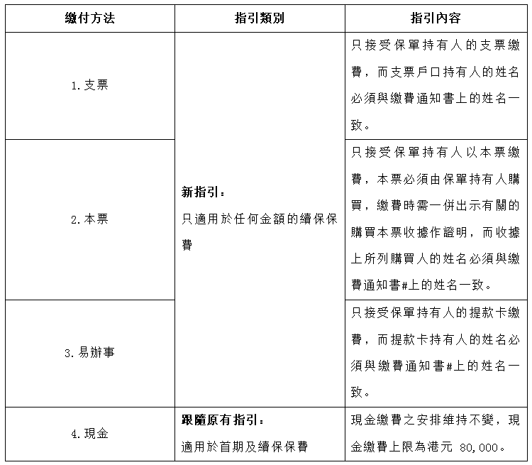 由2020年1月1日開始,保單持有人於香港郵政以支票/本票/易辦事繳付任何保費金額,均必須出示繳費通知書及符合新指引(詳情見下表繳付方法第1至3項)。如未能符合所需要求,香港郵政將拒收該筆款項。