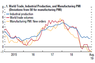 IMF為何要下調預期呢?總的來看,是因為2019年全球主要經濟體製造業活動呈現持續低迷(PMI持續下降)。我們都知道製造業是推動全球經濟發展的核心動能,PMI越低意味著全球需求都在減弱。經濟的運行本就是需求和供給的相互成全,需求減弱供給只會跟隨回落,但這需要一個反應的時間,而這個反應的時間其實就是感覺現在有一些產業沒有發展的動力了。