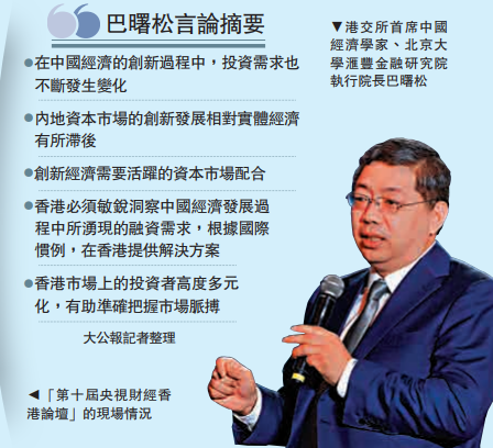 在中國經濟的創新過程中,投資需求也不斷發生變化,巴曙松認為,香港必須要敏銳洞察中國經濟出現創新背後所衍生出來的融資需求,然後根據國際慣例,在香港提供解決方案,「這才是它作為國際金融中心發揮獨特功能的地方」。