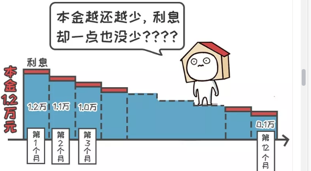 小王用消費貸款買了那件12,000元的傢俱,貸款採用分12期(月)付款的方式,每月除了0.5%的費用,還要支付0.1%的利率。