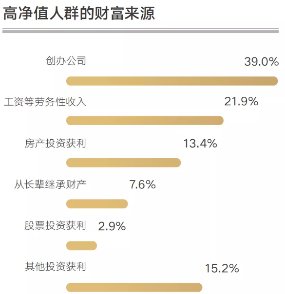 高淨值人群的財富來源,前三位依次為創辦公司(39.0%)、工資等勞務性收入(21.9%)、房產投資獲利(13.4%)。