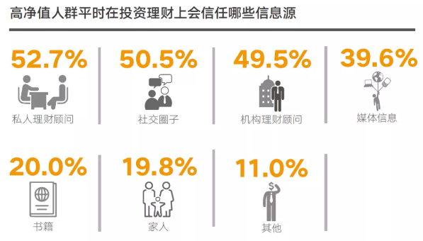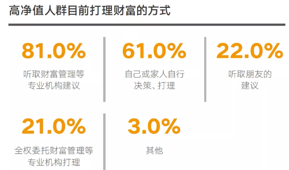 高淨值人群在決策參考上,相當依賴小圈子(私人理財顧問和社交圈),在打理財富的方式上,高淨值人群的主要方式是聽取建議,但自我操盤,這與全權委託專業機構進行託管式管理,還有相當大的差異。