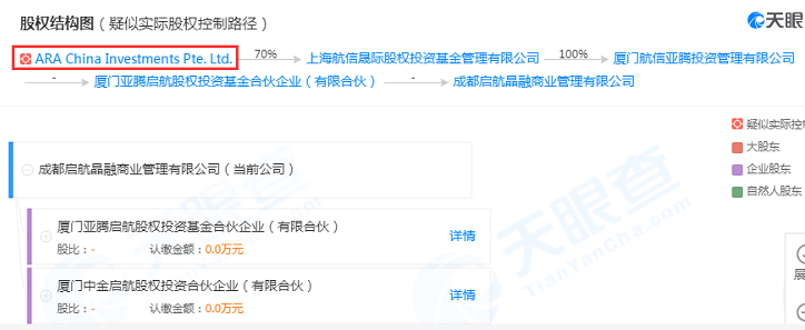 天眼查網站顯示,廈門亞騰啟航股權投資合夥企業是成都啟航晶融商業管理公司兩大股東之一。而廈門亞騰啟航正歸屬於ARA亞騰資產旗下,又間接與李嘉誠有所關聯。