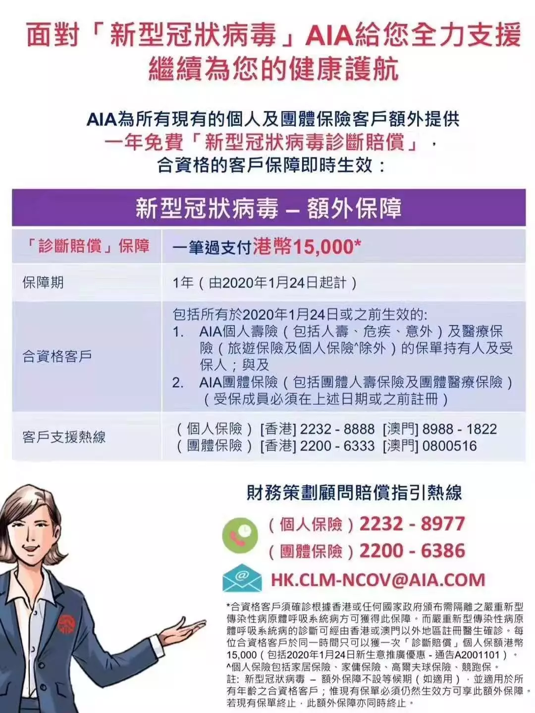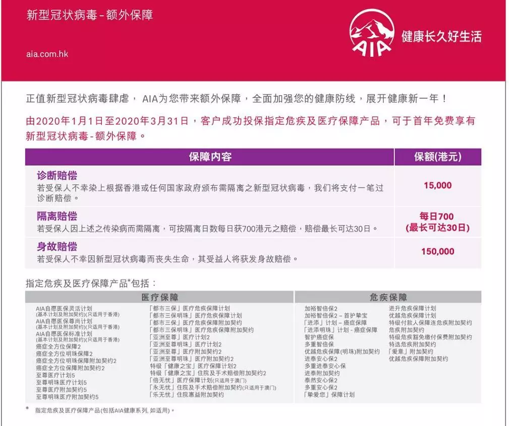 當然,除此之外友邦香港早先公佈的新型冠狀病毒額外保障仍然有效,包括隔離賠償,身故賠償等等。