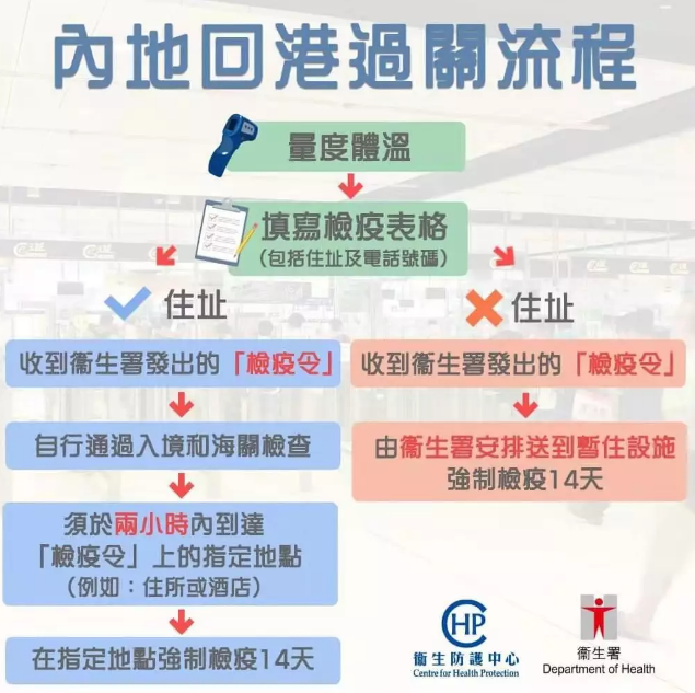3.如無法提供香港住址,將並被送至暫住設施強制檢疫14日;至於可以提供住址的人,將自行通過入境和海關檢查,入境香港後,須於兩小時內到達檢疫令上的指定地點,接受檢疫14日