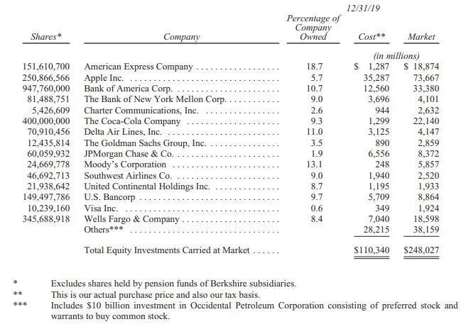 據巴菲特旗下伯克夏爾哈撒韋公佈的最新年度報告,截至2019年底,公司持有股票總市值2480.27億美元,盈利125%。公司前五大持倉中,絕對收益都超過100億美元,而且收益比例也均超過100%。其中第三、第四大持倉可口可樂和美國運通的盈利分別高達16倍和13.7倍。蘋果作為第一大持倉,賬目浮盈達到383.8億美元,收益109%。