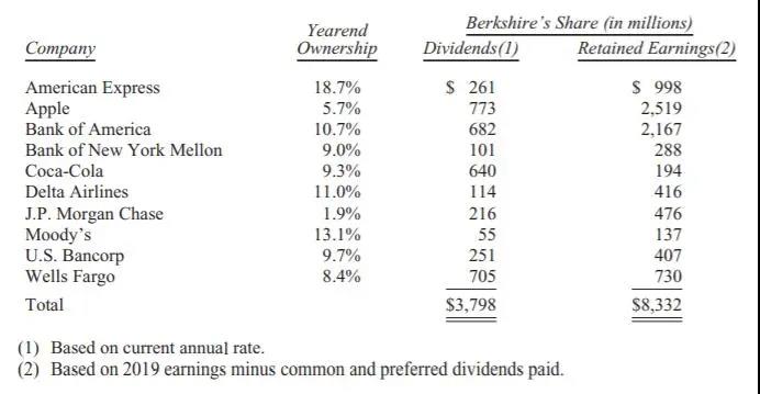 這個清單分別開列了GAAP核算方式下的收益——即伯克希爾投資這十只股票獲得的股息,以及在我們的持倉收益中有多少屬於投資標的公司留存後投入運營的收益。