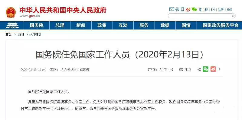 2月13日,國務院公佈全國政協副主席兼秘書長的夏寶龍,將兼任國務院港澳事務辦公室主任。張曉明改任國務院港澳事務辦公室分管日常工作的副主任(正部長級);駱惠寧、傅自應兼任國務院港澳事務辦公室副主任。