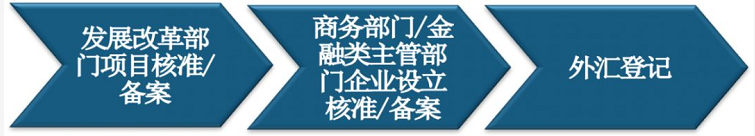 根據相關規定,境內企業進行境外直接投資,需獲得發展改革部門(包括國家發改委和省級發改委)對境外投資專案的審批、商務部門(包括商務部及省級商務主管部門)或金融類企業主管部門對企業設立及具體事項審批,最後憑相關審批檔在銀行辦理外匯登記,如下圖: