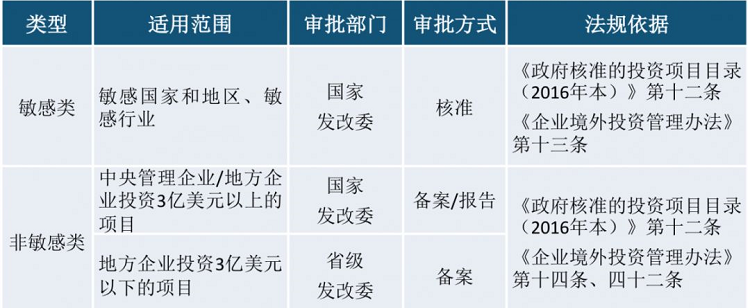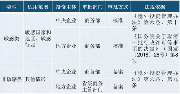 根據商務部發佈的《境外投資管理辦法》,商務部、人民銀行等發佈的《對外投資備案(核准)報告暫行辦法》,商務部對境內企業通過各種方式(如新設、並購)在境外設立非金融企業的,根據境外投資的不同情形——敏感類和非敏感類,分別實行核准和備案管理。