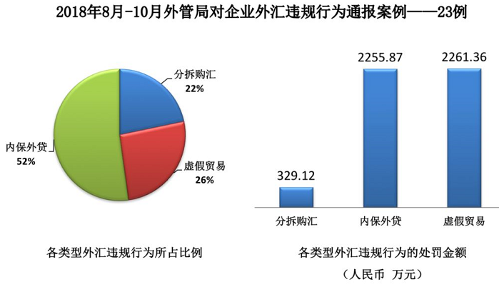 根據外管局2018年8月-10月的外匯違規案例的通報,企業及銀行在內的違規案例共23例,因違規行為共處罰金4,846.35萬元,其中企業被處罰金1,516.82萬元,銀行被處罰金3,329.53萬元。