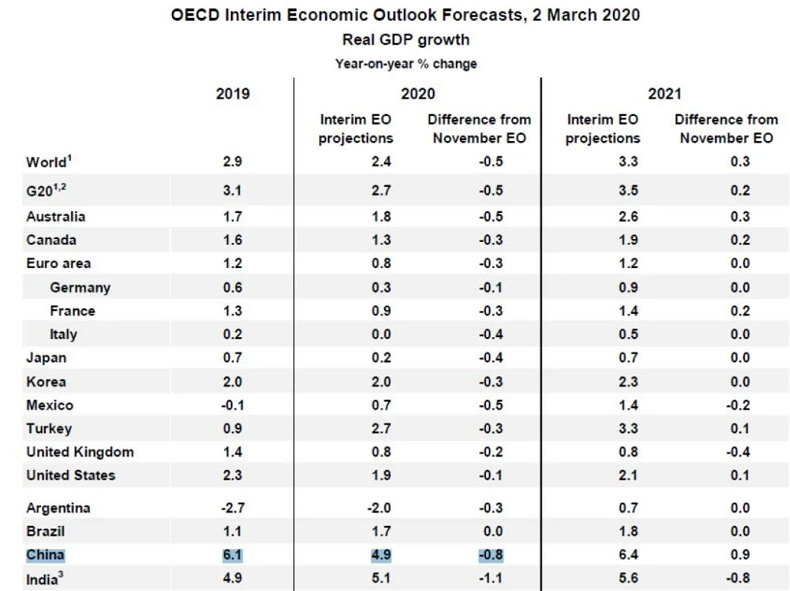 據證券時報,經濟合作與發展組織(OECD)3月2日發佈最新世界經濟展望報告,將2020年經濟增長預期從2.9%下調至2.4%,並警告世界經濟面臨金融危機以來的“最大危險”。