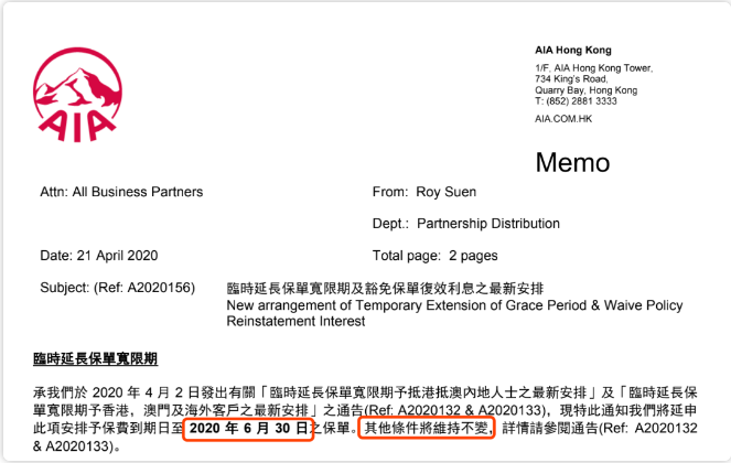AIA友邦於2020年4月2日發出有關「臨時延長保單寬限期」致抵港抵澳內地人士之通告,現特此通知我們將延申此項安排予保費到期日至2020年6月30日之保單,其他條件將維持不變。
