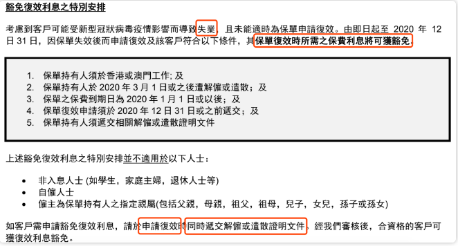 由即日起至2020 年12月31日,因保單失效後而申請複效及該客戶符合以下條件,其保單複效時所需之保費利息將可獲豁免: