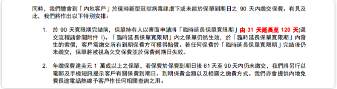 以上接受合資格保單於「臨時延長寬限期」內繳交保費乃是一項臨時行政措施,而並非更改保單合約條款。