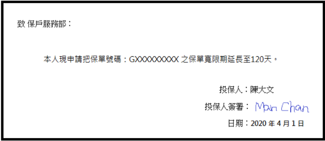 步驟1、保單持有人以書面申請額外延長30天保單寬限期並簽署(請參考下列範本)。