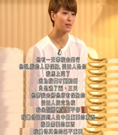 因為我沒期待過這個,因為我們剛剛結完婚兩三日,他將他所有保險受益人寫了我的名字。我坐在那裏,覺得已經找到人生當中最重要的東西了,最需要的東西,其他的我覺得已經不重要了。