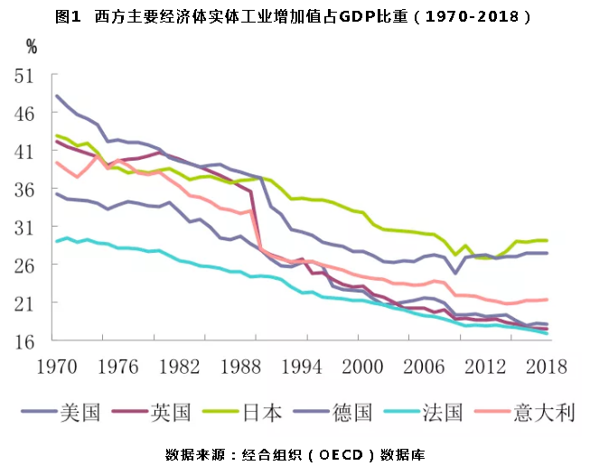 縱觀人類經濟活動史,實體部門增速始終是利率的天花板,長期經濟回報率決定借貸利息水準。1970年至2018年,西方主要經濟體實體工業增加值占本國GDP比重持續下滑了將近一半。在實體部門長期低回報水準的壓制下,低利率的力量逐漸蓄勢,最終形成了“穿越週期的趨勢性力量”(Cúrdia,2015)。