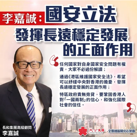 針對全國人大最快將在5 月28 日表決通過國安法,香港首富、長和集團高級顧問李嘉誠首度向媒體回應,表示國安法立法將可發揮長遠穩定的正面作用。