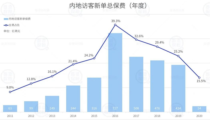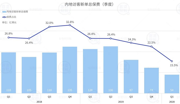 受到2月8日起疫情封關的影響,內地訪客帶來的新單保費在2020年一季度達54億港元,占個人業務總新造保單保費的15.5%。