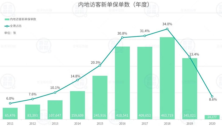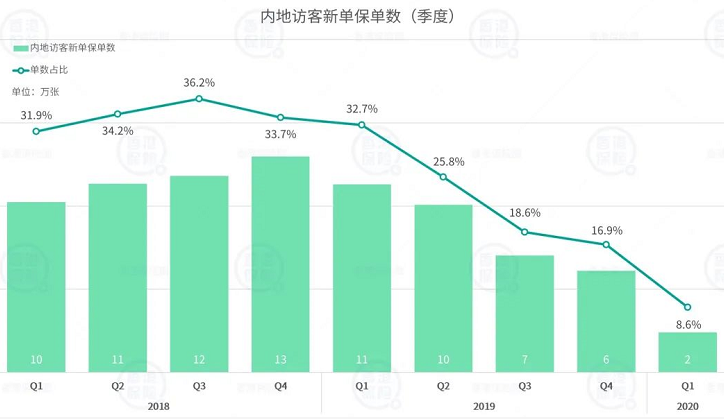 香港在這次新冠疫情中的早期防疫做得相當不錯,控制成效在全球名列前茅。2月8日開始香港暫停了內地遊客自由行,並要求從內地入境的人士強制接受檢疫14天,很多家庭赴港投保計畫擱淺。香港保險在2020年開年1個月時間,內地訪客新造保單保費達54億港元。