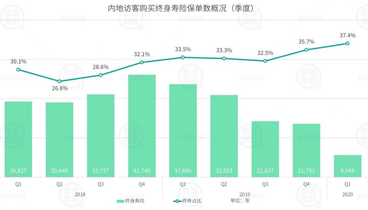 內地訪客購買終身壽險保單數量,占比維持在30%-40%左右,大幅增長。