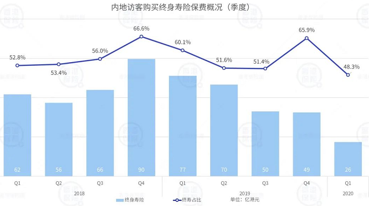 終身壽險的保費下降:2020年一季度占比高達48.3%,2019年一季度占比為60.1%;