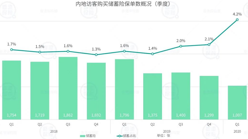儲蓄險的數量上漲:2020年一季度占比4.2%,比2019年一季度(1.6%)大幅上漲。