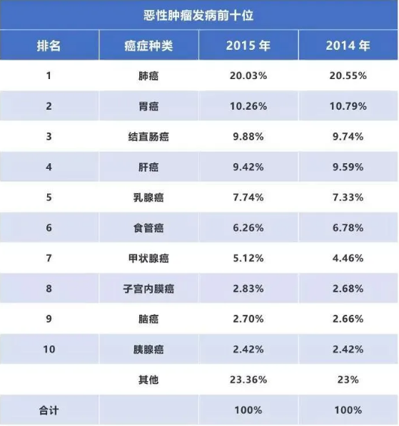 發病前五位的男性是肺癌、胃癌、肝癌、結腸癌和食道癌,女性是乳腺癌、肺癌、結直腸癌、甲狀腺癌和胃癌。