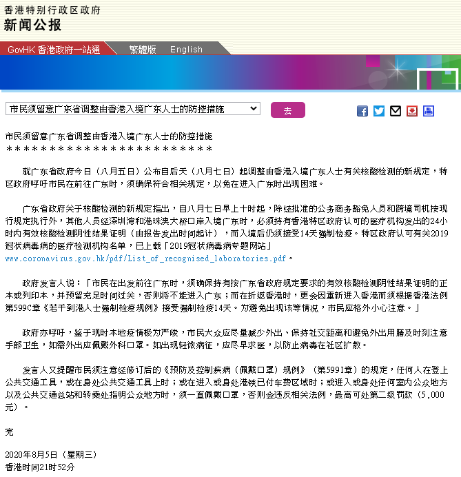 自2020年8月7日上午10時起,由香港經深圳灣口岸入境人員,入境時必須持有粵港兩地政府認可的具備資質的檢測機構出具的生成時間為24小時內的核酸檢測陰性結果紙質報告,並接受14天集中隔離醫學觀察。經批准豁免入境隔離的重要公務商務人員、跨境貨車司機等人員,按現行規定執行。特此通告。