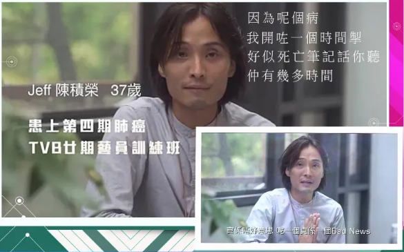 現年37歲、TVB第20期藝員訓練班畢業的陳積榮(Jeff),哥哥是知名武術指導陳中泰。Jeff昨日突然拍片公開自己患上第四期肺癌,影片一開始說:「因為呢個病,我開咗一個時間掣,好似死亡筆記話你聽仲有幾多時間。」令人感到相當絕望。