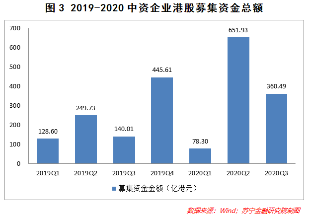 Wind數據顯示,2020年二季度、三季度(7月至今),中資企業港股融資金額大幅攀升,融資額分別高達652億元、360億元,均較去年同比增長了150%以上,火爆程度可見一斑。