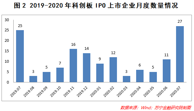 IPO增量來源,很大一部分來自於科創板。自2019年7月首批企業上市以來,科創板IPO企業數量呈現出非常穩定的趨勢,每個月少則3-5家,多則十幾家。2020年一季度,因受疫情影響,科創板IPO進度有所停滯,但6月份之後,IPO發行速度明顯提升,7月更是創下了科創板開閘以來的月度發行最高峰,全月累計IPO數量高達27家。