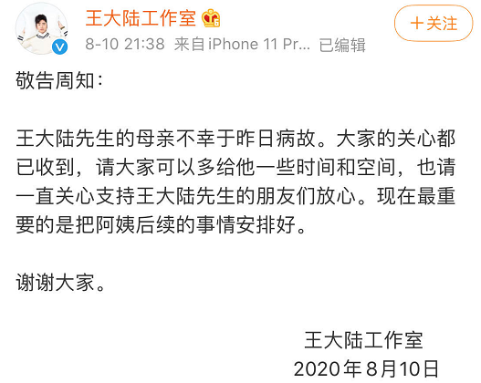 8月10日,有媒體爆料稱演員王大陸的母親因為腦幹腫瘤破裂,於9日宣佈去世。隨後,王大陸工作室也發微博證實了噩耗。