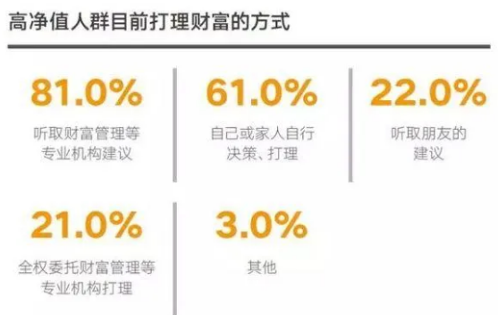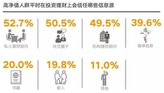 高淨值人群在決策參考上,相當依賴小圈子(私人理財顧問和社交圈),在打理財富的方式上,高淨值人群的主要方式是聽取建議,但自我操盤,這與全權委託專業機構進行託管式管理,還有相當大的差異。