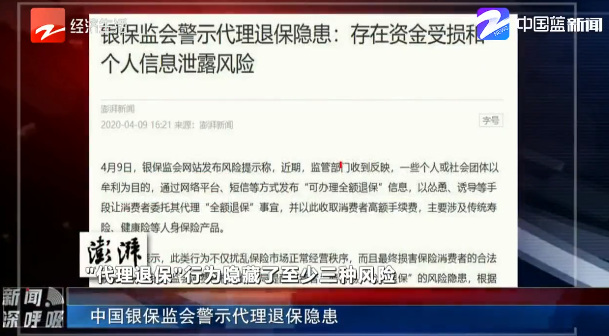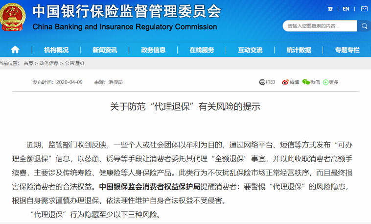 今年4月9日,銀保監會發佈《關於防範“代理退保”有關風險的提示》,提示廣大消費者根據自身需求謹慎辦理退保,依法理性維護自身合法權益不受侵害。