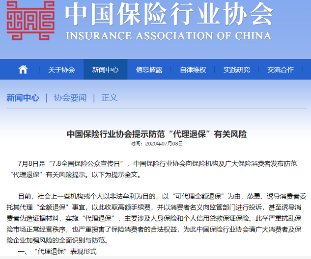 7月8日,中國保險行業協會向保險機構及廣大保險消費者發佈防範“代理退保”有關風險的提示,各地20多家保險行業協會也陸續發佈提示。