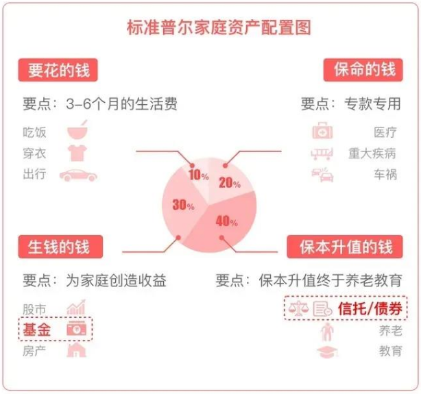 “標準普爾家庭資產象限圖”把家庭資產分成四個帳戶,這四個帳戶作用不同,所以資金的投資管道也各不相同。一般來講,第一、第二個帳戶的配比相對固定,第三、第四個帳戶根據個人的風險進行調整,風險承受能力高,就調高第三個帳戶的占比,風險承受能力低,就調高第四個帳戶的占比。