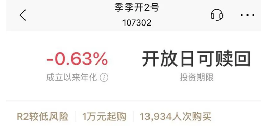 除了“季季開1號”,招商銀行APP上出售的“季季開2號”也出現了淨值回撤,成立以來年化收益率為-0.63%,6月3日的單位淨值為0.9996。