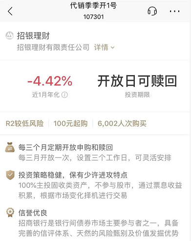 一家是招商銀行,其子公司招銀理財出售的一款理財產品“季季開1號”近1月年化收益率為-4.42%。