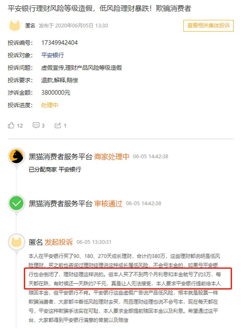 黑貓平臺上一位投資者稱,購買平安銀行90天、180天、270天成長理財,合計約380萬元,然而不到兩月連本帶利虧損3萬元,有時甚至一天虧7000元。