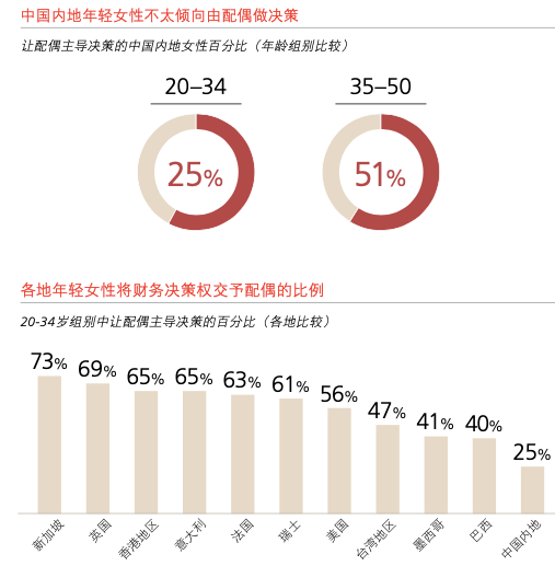 中國內地年輕女性更傾向改變現狀,僅25%的受訪者表示將財務決策權交予配偶。與全球各市場相較,比例最低。