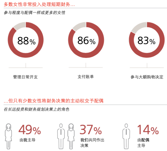 研究顯示,超過80%的中國內地女性已非常投入管理自己的短期財務事宜。同時更多的中國內地受訪者(86%)表示她們會在長遠投資和財務規劃決策上擔任主導的角色,這遠遠高於全球水準42%