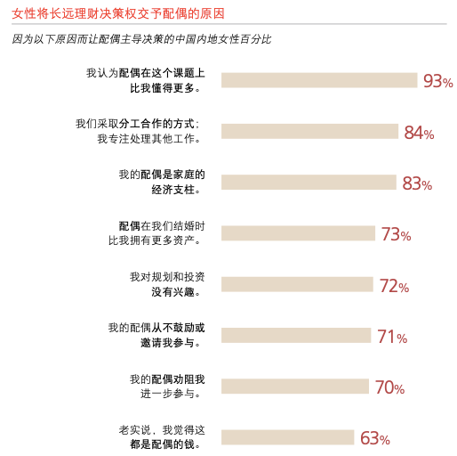 在中國內地,14%受訪女性表示會讓丈夫主導財務決策,而當中多達93%的女性認為她們的配偶比自己更懂得長遠理財,這正是她們選擇讓丈夫主導財務決策的主要原因。