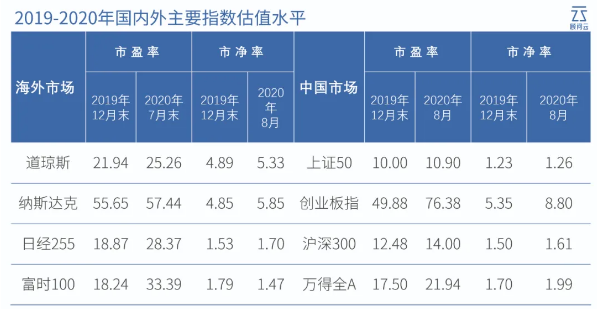 再者,根據Wind數據顯示,截止2020年8月,國內主要指數的估值水準,與美、日、歐等主要資本市場比較而言,除創業板指數的估值處於相對較高水準之外,其他主要指數仍處於相對較低水準或相當水準。
