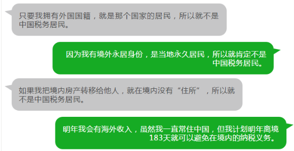 其實,對於原先習慣性居住於中國境內的個人而言,這些結論都是錯誤的。根據中國個人所得稅法及其實施條例,中國稅務居民的判據可以歸納如下: