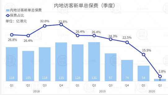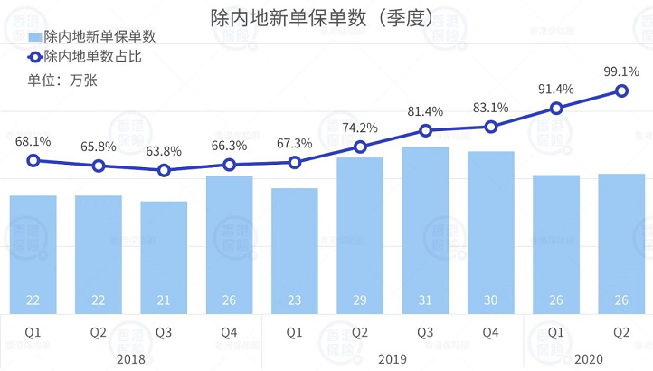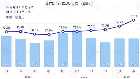 2020年第二季度除內地的新單總保費高達295億港元,2020年前兩個季度業務量基本持平(第一季度296億港元),占個人業務總新造保單保費的97.2%。